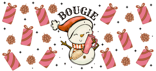 A cheerful snowman in a Santa hat holds a pink drink, surrounded by festive packages and pinecones, celebrating the holiday spirit.UV Transfers dtf prints
