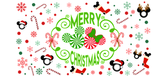 A festive graphic featuring the words "Merry Christmas" with colorful candy canes, snowflakes, and ornaments in vibrant reds and greens.UV Transfersdtf regular iron