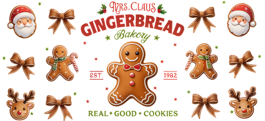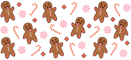 Festive and cheerful, this gingerbread-themed design features smiling cookies, Santa, and reindeer, perfect for holiday celebrations!UV Transfers dtf transfers