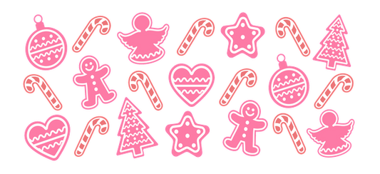 A whimsical collection of pink Christmas-themed icons featuring ornaments, gingerbread figures, stars, hearts, trees, and candy canes.UV Transfersdtf regular iron