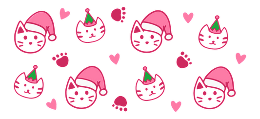 A playful design featuring adorable pink cats in festive hats, complemented by hearts and paw prints, perfect for holiday cheer!UV Transfers dtf prints