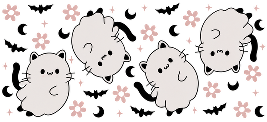 A cute illustration of adorable chubby cats surrounded by pink flowers and a whimsical black background.UV Transfers heat press transfers