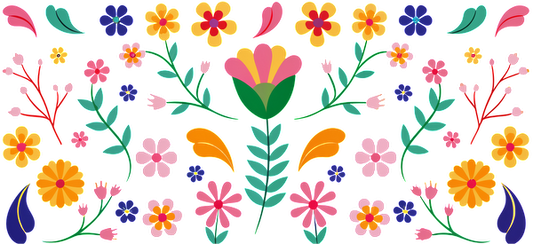 A vibrant floral pattern featuring colorful flowers and leaves, perfect for adding a cheerful touch to designs.UV Transfers heat press transfers