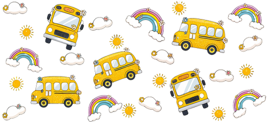 A playful pattern featuring charming yellow school buses, rainbows, sun icons, and fluffy clouds against a bright background.UV Transfers dtf prints