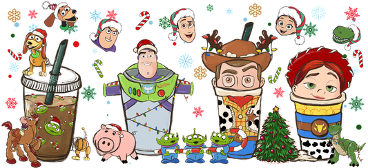 Festively designed cup characters inspired by beloved animated toys, featuring playful holiday elements like candy canes and Christmas trees.UV Transfers heat press transfers