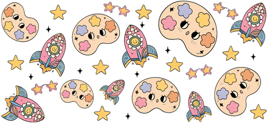 A colorful, whimsical pattern featuring adorable beans, rockets, and stars, perfect for a playful, creative vibe.UV Transfers dtf prints