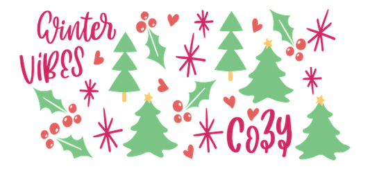 A joyful winter-themed design featuring evergreen trees, holly, and cheerful elements with the text "Winter Vibes Cozy."UV Transfersdtf regular iron