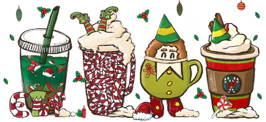 Celebrate the holidays with whimsical drinks featuring festive colors, playful elf characters, and delightful candy cane accents!UV Transfers heat press transfers