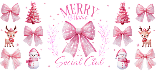 A cheerful pink-themed graphic featuring festive bows, snowmen, Christmas trees, and adorable reindeer, perfect for holiday celebrations.UV Transfers heat press transfers