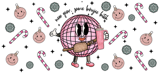 This playful illustration features a cheerful pink disco ball character holding a drink, surrounded by festive candy canes and smiling ornaments.UV Transfers