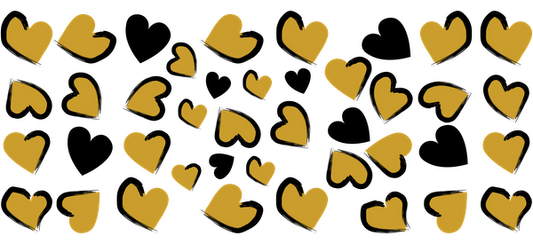 Una colección caprichosa de corazones dorados dispersos de manera divertida sobre un fondo negro, perfectos para agregar un toque de amor. Transferencias UV
