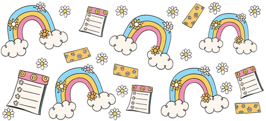 A cheerful design featuring colorful rainbows, fluffy clouds, and playful daisies, perfect for brightening up notes or stationery.UV Transfers dtf prints