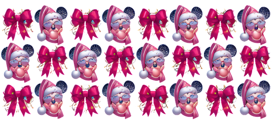 A festive collection of cute, pink-clad Santa-themed icons with bows, perfect for holiday decorations or designs.UV Transfers heat press transfers