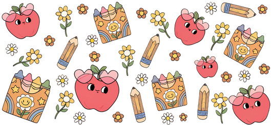 A whimsical pattern featuring adorable apples, colorful crayons, cheerful flowers, and playful smiling designs, perfect for kids' art projects.UV Transfersdtf regular iron