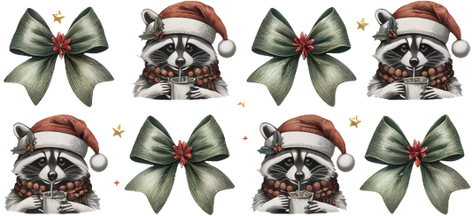 A whimsical holiday-themed design featuring cheerful raccoons in Santa hats surrounded by festive bows and stars.UV Transfers dtf prints