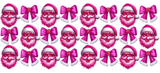 A colorful pattern featuring cheerful Santa faces with pink hats, fluffy white beards, and vibrant pink bows.UV Transfers dtf transfers