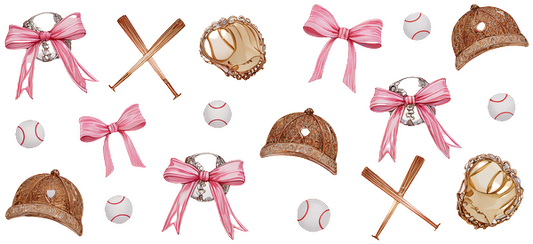 A playful collection of baseball-themed illustrations featuring hats, gloves, bats, and baseballs, all accented with pink bows.UV Transfers dtf transfers