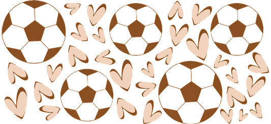 A playful pattern featuring brown soccer balls surrounded by light-colored hearts, symbolizing a love for the game.UV Transfers dtf transfers