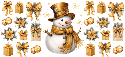 A cheerful snowman in a golden top hat and scarf, surrounded by festive gifts, bows, and winter decorations in gold and silver.UV Transfers heat press transfers