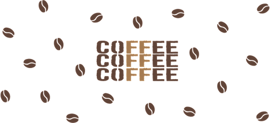 Un diseño alegre que presenta la palabra "CAFÉ" en varios colores, rodeada de granos de café dispersos. Transferencias UV