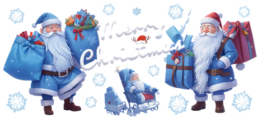 Cheerful Christmas scene featuring Santa Claus in blue attire, surrounded by gifts and a small Santa in a sleigh.UV Transfersdtf regular iron