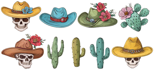 A vibrant collection of illustrated sombreros, cacti, and decorated skulls, capturing a lively, festive Mexican tradition.UV Transfers dtf prints