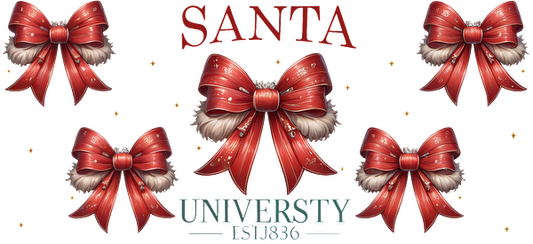 Festive design featuring red bows and "Santa University" established in 1836, perfect for holiday-themed decor.UV Transfers dtf prints