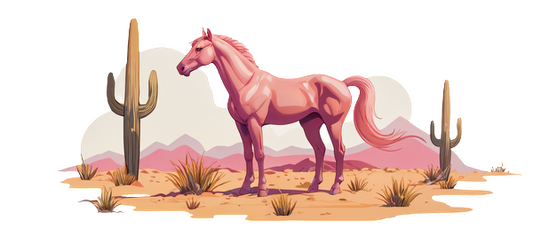 A whimsical pink horse stands proudly in a desert landscape, surrounded by cacti and distant mountains.UV Transfersdtf regular iron