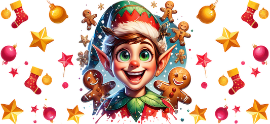 A cheerful elf with big eyes and a bright smile surrounded by festive decorations like gingerbread cookies, stars, and ornaments.UV Transfers dtf transfers
