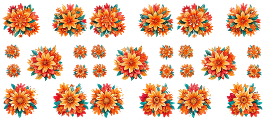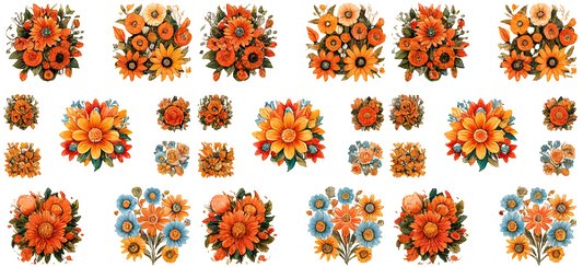 A vibrant collection of multicolored flower illustrations, featuring various sizes and detailed petals in shades of orange and teal.UV Transfersdtf regular iron
