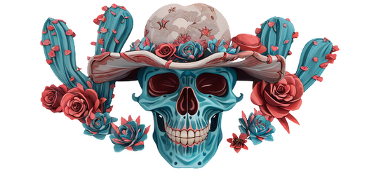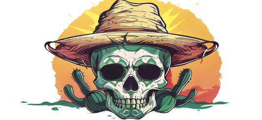 A vibrant, artistic depiction of a skull adorned with a straw hat, surrounded by cacti against a sunset backdrop.UV Transfers heat press transfers