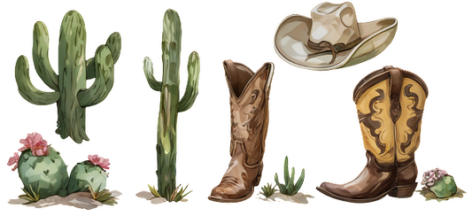 A charming collection of cowboy boots, a stylish hat, and vibrant cacti with flowers, showcasing a western theme.UV Transfers dtf prints