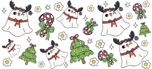 A whimsical pattern featuring adorable ghosts with reindeer antlers, holiday trees, candy canes, and cheerful daisies.UV Transfers dtf prints