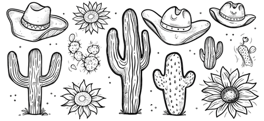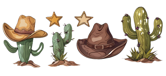 A playful collection of illustrated cacti and cowboy hats, perfect for a Western-themed design or decoration.UV Transfers dtf transfers