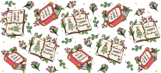 A whimsical pattern of illustrated books with holiday messages, featuring Christmas trees and floral accents, perfect for festive decor.UV Transfersdtf regular iron