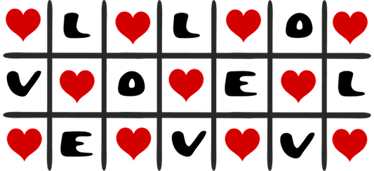 Un diseño divertido de tres en raya que presenta corazones rojos en lugar de marcadores tradicionales, colocados sobre una cuadrícula negra. Transferencias UV