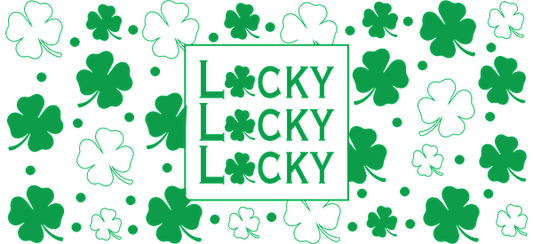 Celebre la suerte con este diseño verde vibrante que presenta la palabra "Lucky" rodeada de tréboles. Transferencias UV