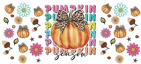 Un diseño vibrante con temática de otoño que presenta una calabaza con un lazo con estampado de leopardo, rodeada de flores coloridas y un texto divertido. Transferencias UV