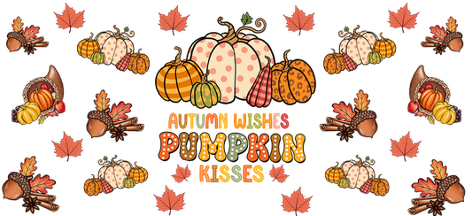 Un lindo diseño con temática otoñal que presenta calabazas coloridas, hojas otoñales y la alegre frase "Deseos de otoño, besos de calabaza". Transferencias UV