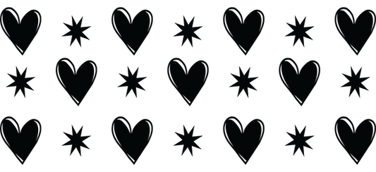Un patrón divertido que presenta corazones alternados y formas de estrellas en un diseño negro minimalista, perfecto para una estética alegre. Transferencias UV