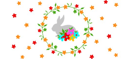 Un lindo conejito gris rodeado de una colorida corona floral, sobre un fondo de flores vibrantes. Transferencias UV