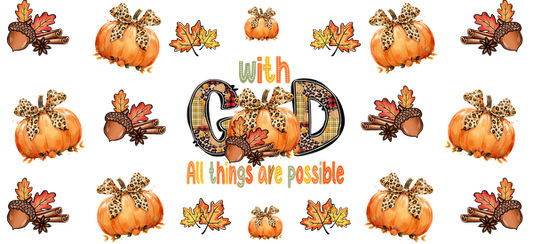 Un diseño festivo con temática otoñal que presenta calabazas, hojas y el mensaje alentador: "Con Dios, todo es posible". Transferencias UV