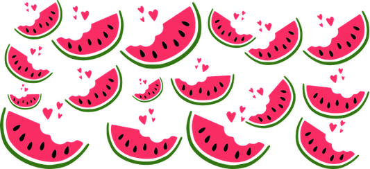 Un patrón divertido de coloridas rodajas de sandía y lindos corazones, ¡perfecto para un ambiente veraniego divertido! Transferencias UV