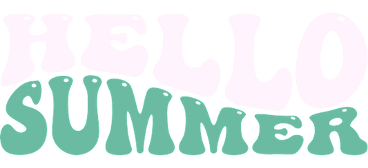 Un gráfico colorido "Hola verano" con letras onduladas y divertidas en rosa y verde para una atmósfera veraniega alegre. Transferencias UV