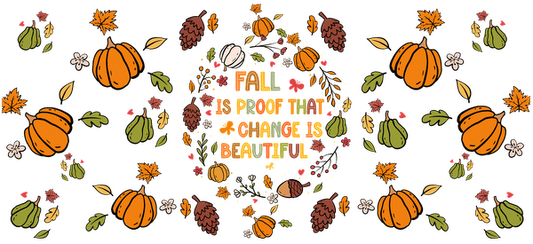 Una vibrante ilustración con temática otoñal que presenta calabazas, hojas y flores, con la cita inspiradora: "El otoño es la prueba de que el cambio es hermoso". Transferencias UV