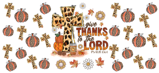 Un diseño festivo que presenta una cruz con estampado de leopardo, hojas de otoño, calabazas y la frase "Dad gracias al Señor". Transferencias UV