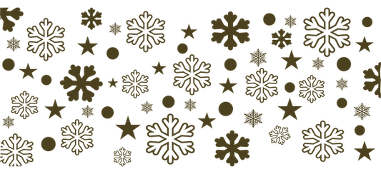 Un patrón caprichoso que presenta una combinación de copos de nieve, estrellas y círculos en un diseño festivo, perfecto para las celebraciones invernales. Transferencias UV