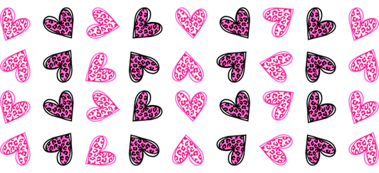 Un patrón vibrante que presenta corazones rosados con detalles de estampado de leopardo sobre un fondo negro, perfecto para agregar un toque divertido. Transferencias UV
