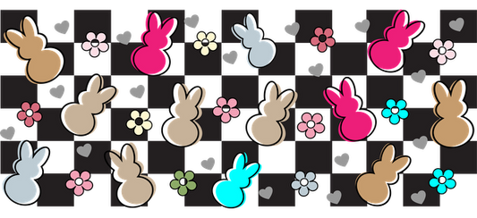 Un patrón divertido que presenta siluetas de conejos coloridos y flores sobre un fondo de tablero de ajedrez, perfecto para una decoración con temática primaveral. Transferencias UV