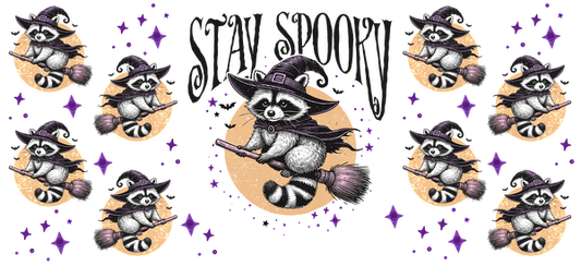 Una ilustración caprichosa que presenta un encantador mapache con sombrero de bruja volando en una escoba, rodeado de estrellas brillantes. Transferencias UV